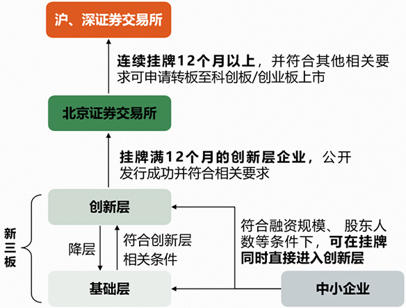 新三板创新层企业挂牌满12个月以上,满足有关上市条件,即可申请在北京证券交易所上市。